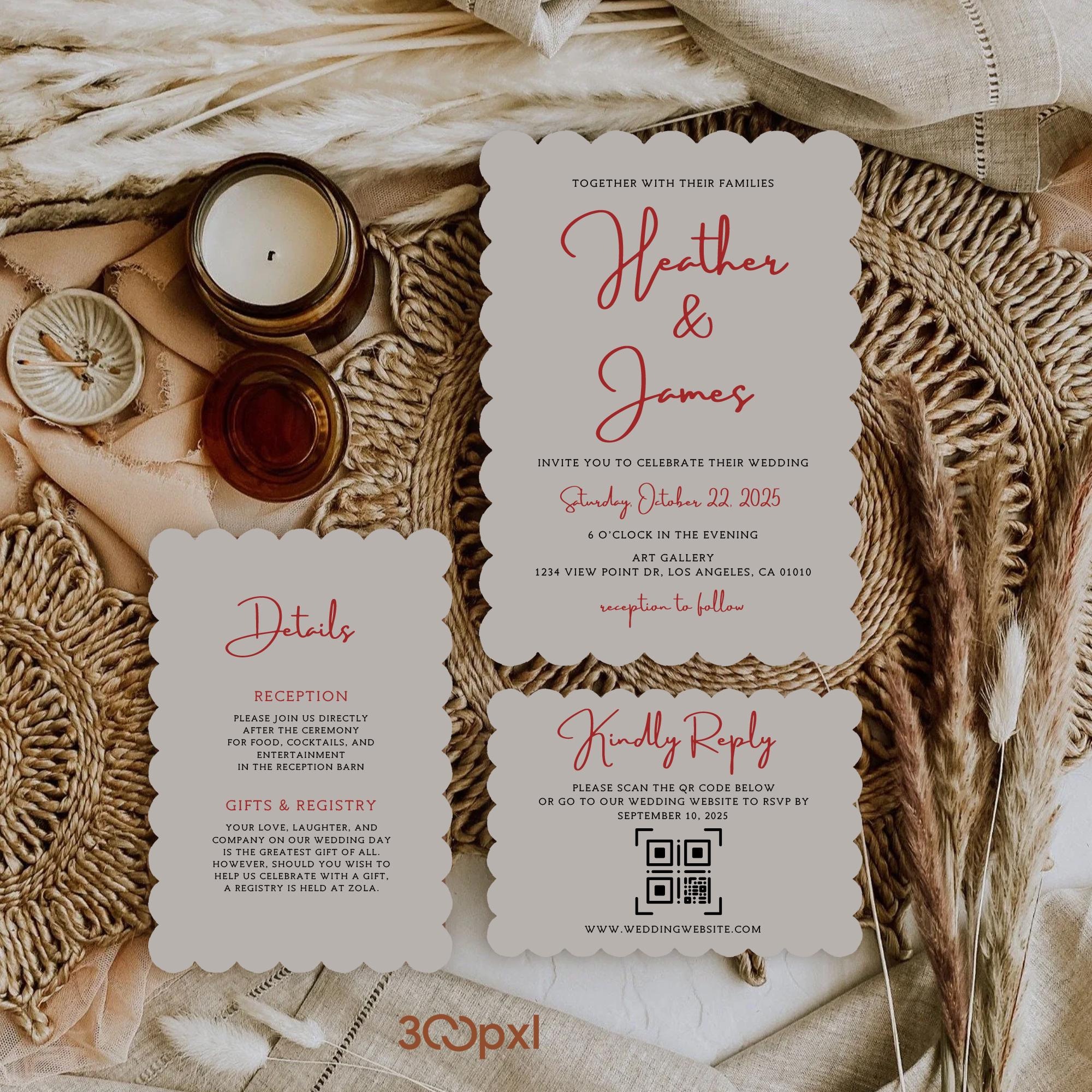 Make your wedding invitation elegant, modern, and effortlessly digital with this scallop-edged wedding website invitation set. Featuring handwritten calligraphy and a whimsical design, this style is perfect for couples who want a chic and timeless way to invite guests.